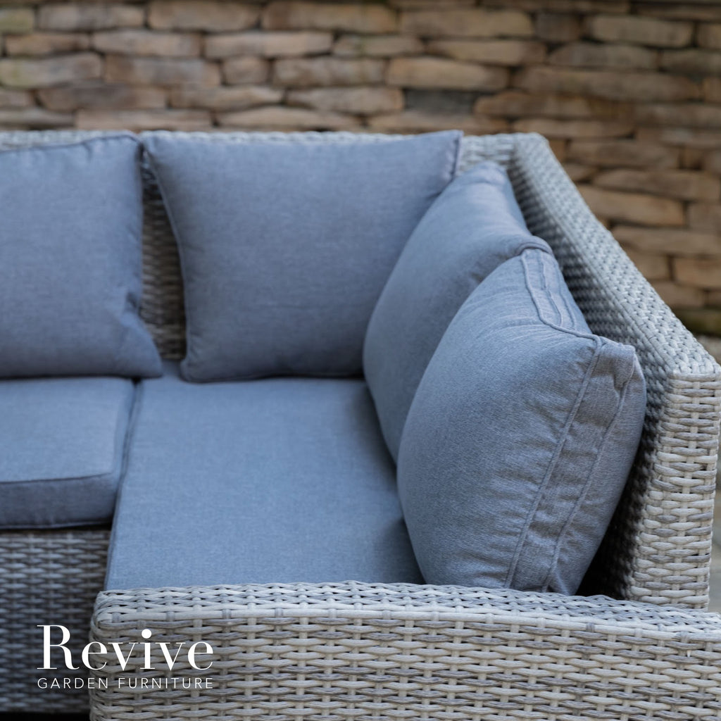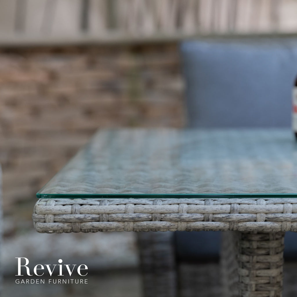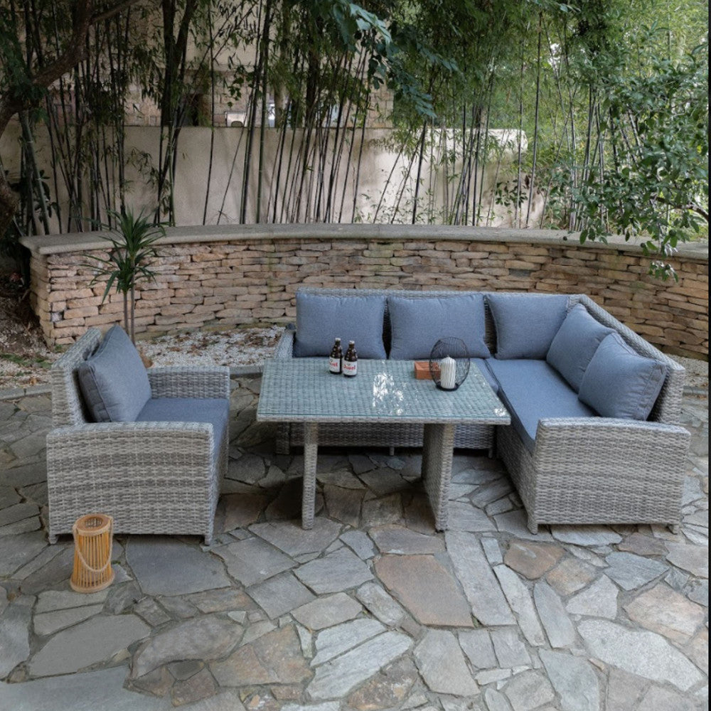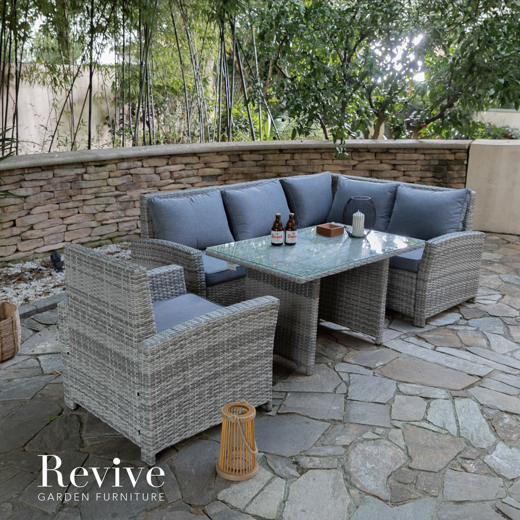 As beautiful as it is practical, The Kansas Corner Set makes no compromise on delivering a luxury outdoor dining experience. With seating for up to 6 people, this stylish modern sofa set is ideal for entertaining and bringing the family together in your outdoor living space. Designed with the best all-weather rattan, crafted from a high-quality rattan weave with varied textures and tones woven around 1.2mm thick frames that are powder-coated. The tabletop is made of 5mm tempered glass for safety.