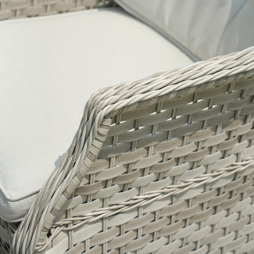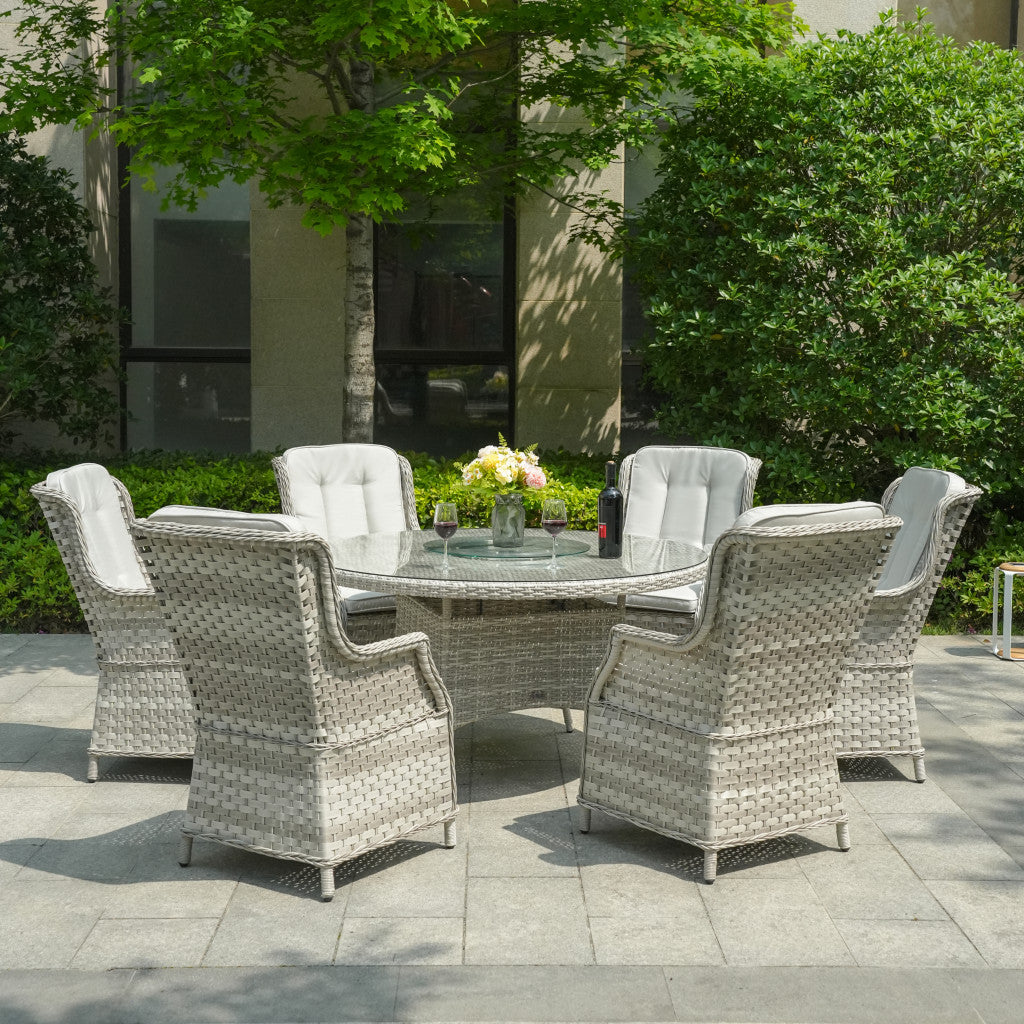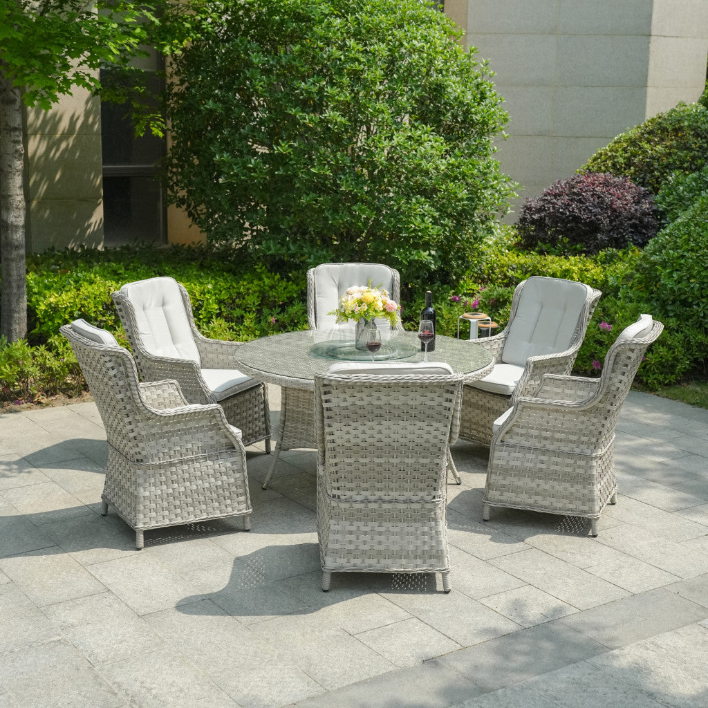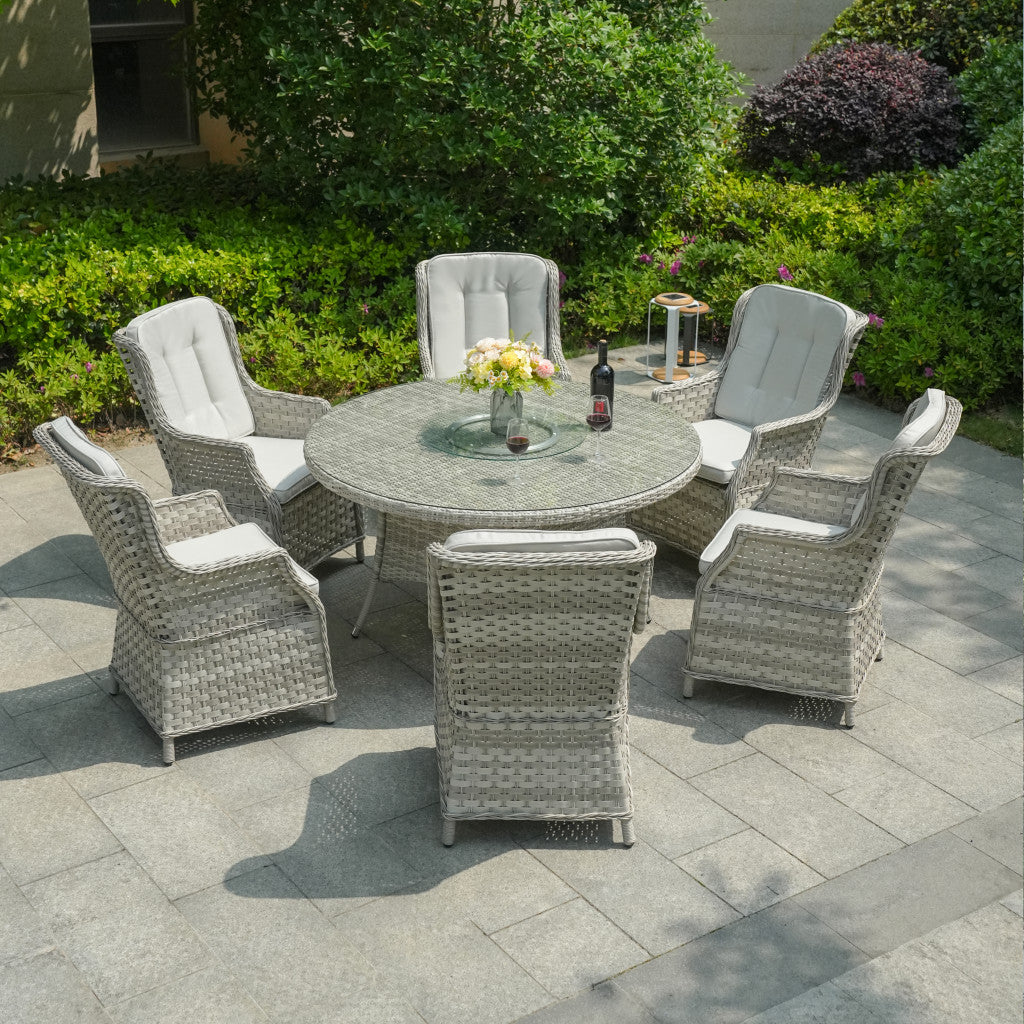 Introducing the Ravenna 6-Seater Set in a captivating, white-washed finish, a luxurious addition to any garden or patio. Whether you're indulging in fine dining or enjoying a relaxed morning coffee, this set offers durability and sustainability, ensuring years of enjoyment. The high-back chairs not only provide optimum support and comfort but also add a stylish touch to your outdoor space, elevating your dining experience to new heights.