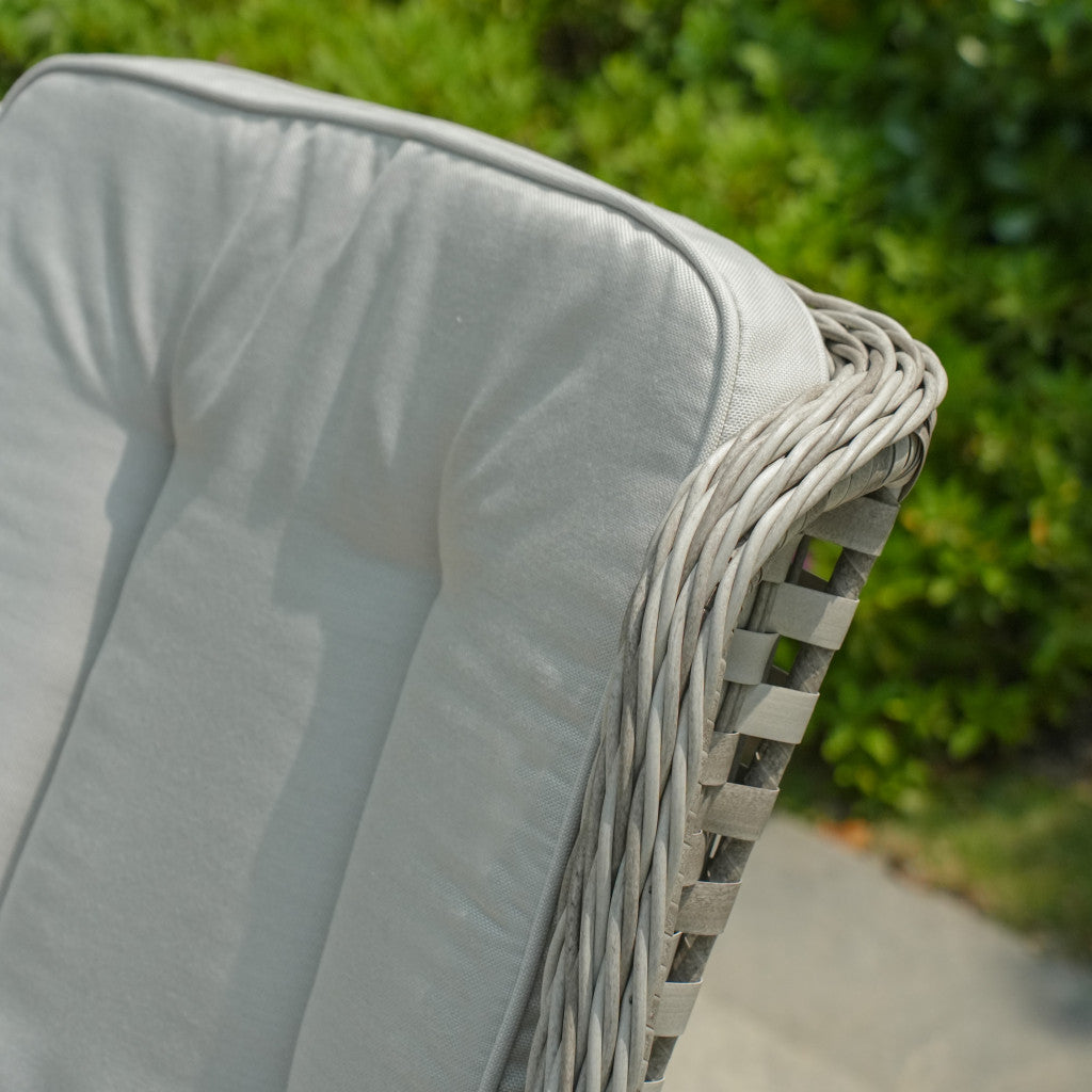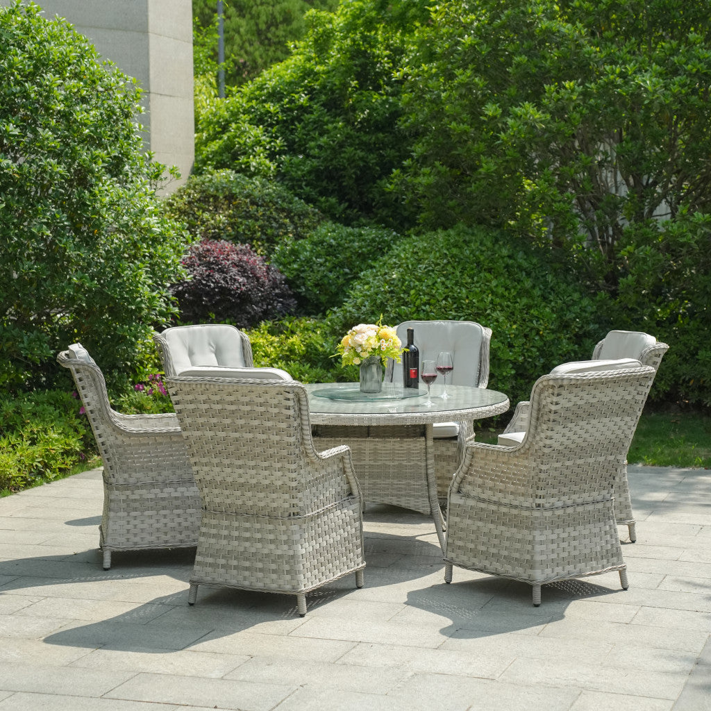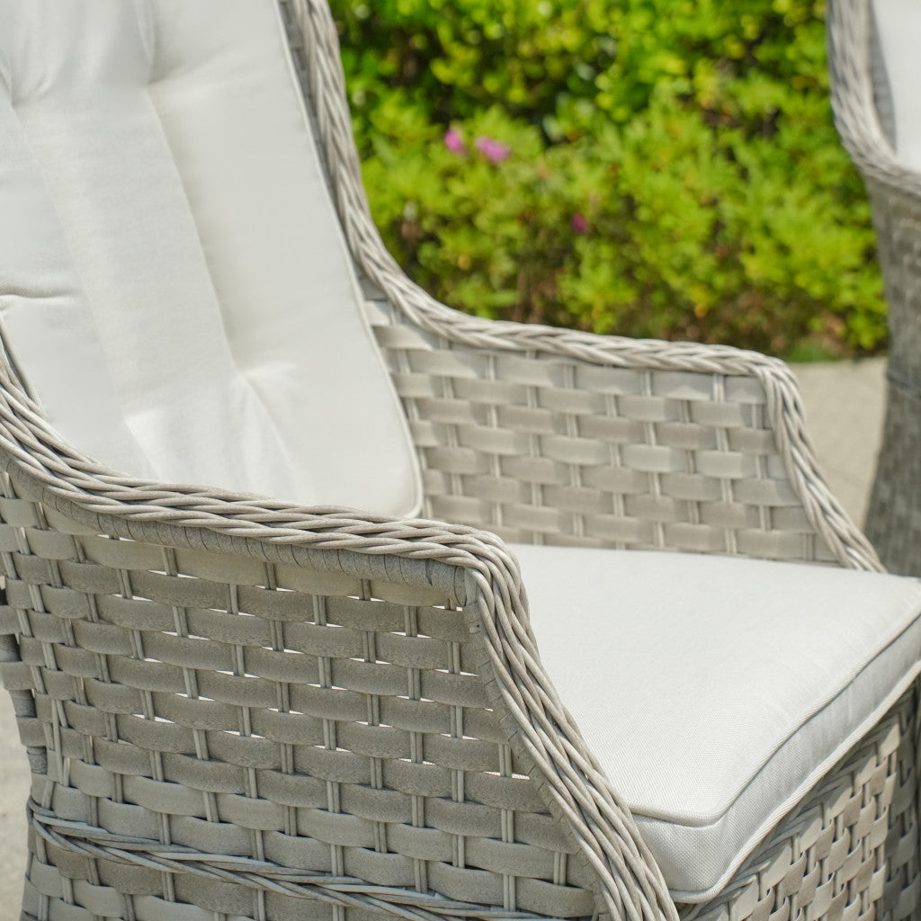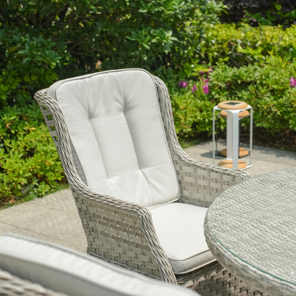 Introducing the Ravenna 6-Seater Set in a captivating, white-washed finish, a luxurious addition to any garden or patio. Whether you're indulging in fine dining or enjoying a relaxed morning coffee, this set offers durability and sustainability, ensuring years of enjoyment. The high-back chairs not only provide optimum support and comfort but also add a stylish touch to your outdoor space, elevating your dining experience to new heights.