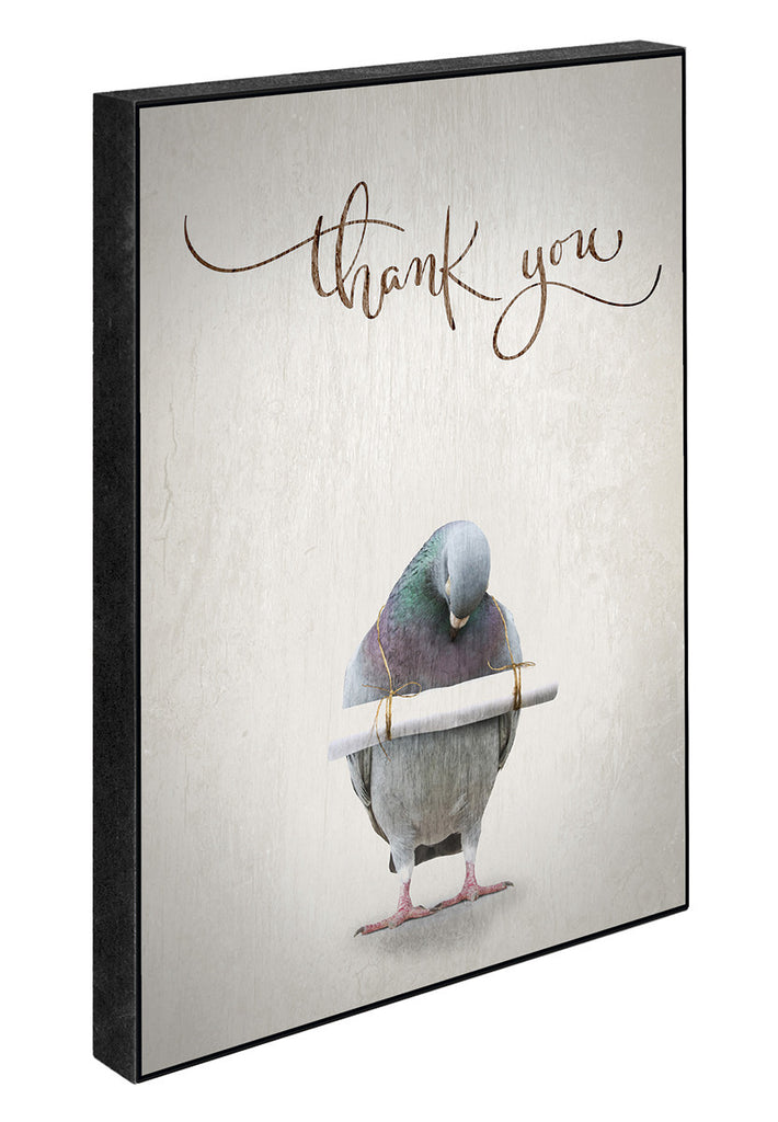 This art block shows a pigeon holding a message in its beak with the lettering 'Thank You' above on a white background.